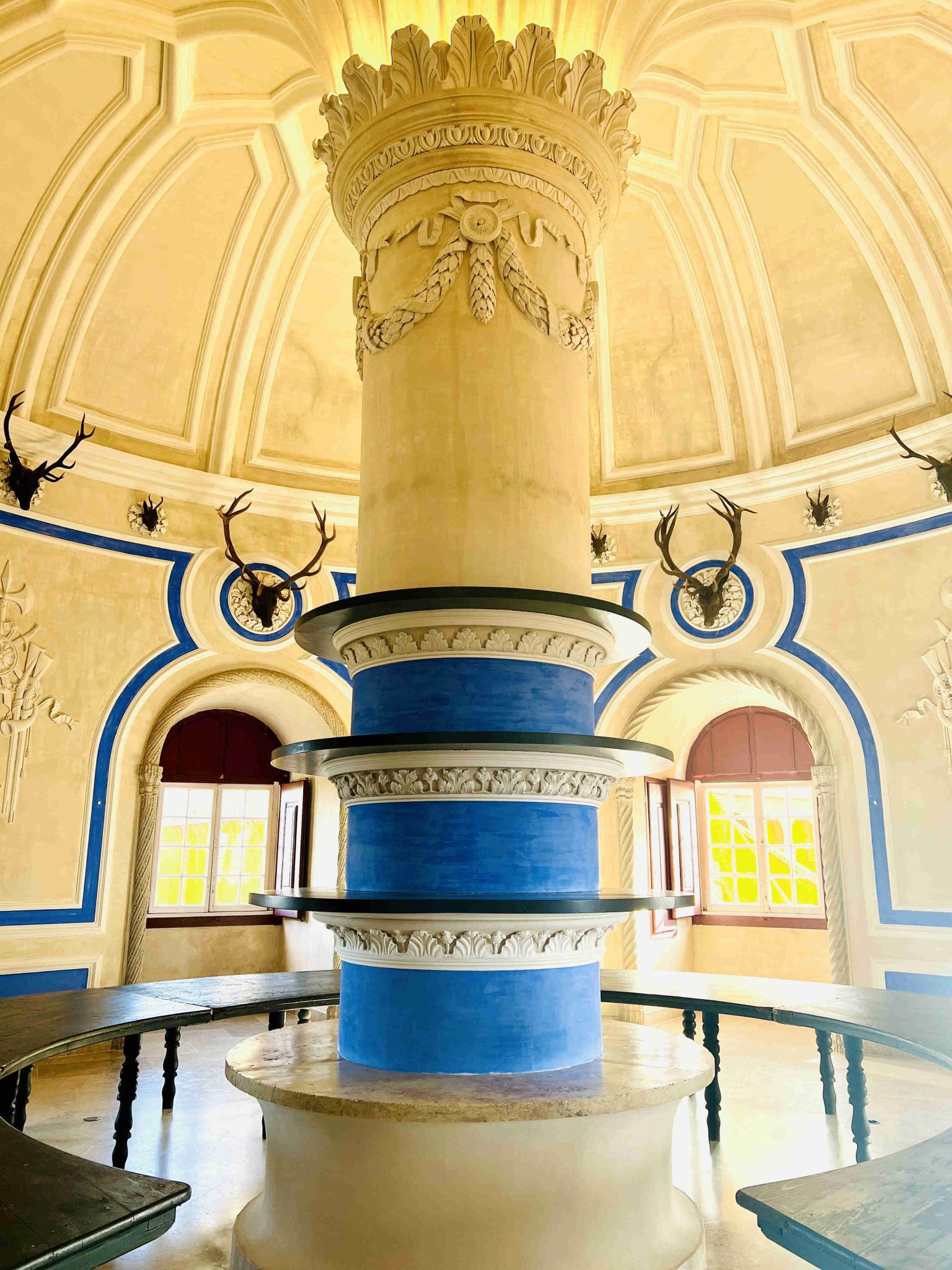 The Stag Room in Pena Palace, designed as a banquet hall with a circular table, highlighting the architectural wonders of Sintra, Portugal