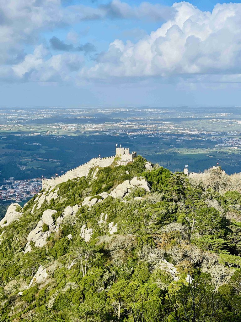 (A view of the Moorish Castle while climbing its steep paths, offering breathtaking panoramic views of Sintra)