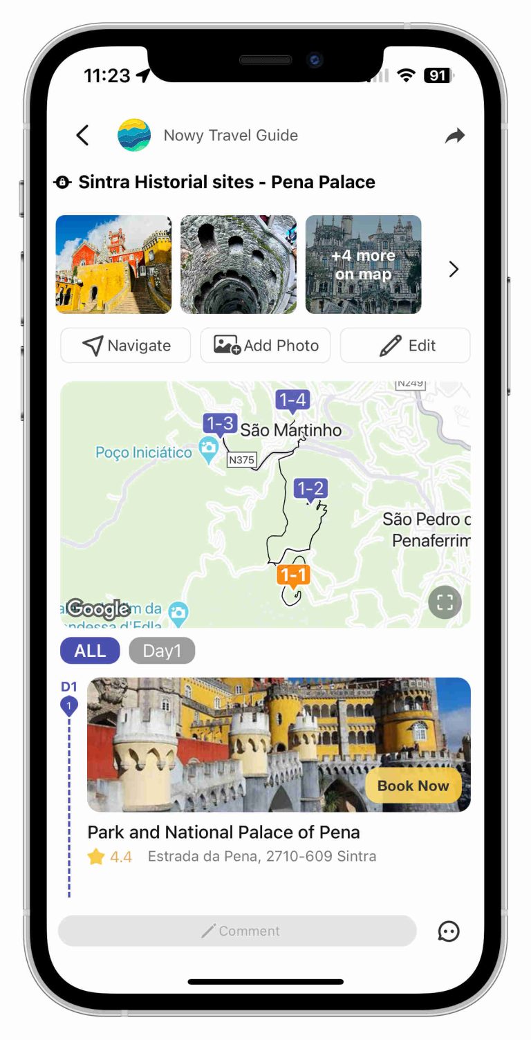 Reserve your cherished Sintra memories with Nowy’s intuitive travel journaling feature. Nowy empowers you to create a personalized digital album filled with your photos, thoughts, and experiences as you explore the enchanting sights of Pena Palace and beyond.