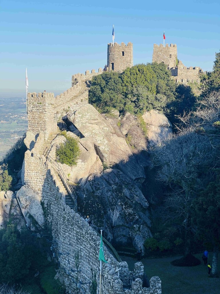 Perched atop a rugged hill overlooking the town of Sintra, the Moorish Castle (Castelo dos Mouros) is a testament to the region’s rich and diverse history. Built in the 8th and 9th centuries by the Moors, this ancient fortress served as a strategic defense point during the Reconquista. The castle’s weathered walls and towering ramparts seem to grow organically from the rocky landscape, creating a striking visual harmony between architecture and nature. As I approached the entrance, I couldn’t help but feel a sense of awe and reverence for the countless stories these stones could tell.
