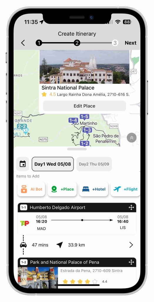 Nowy makes it easy to keep all your Pena Palace and Sintra travel information in one place. With our flight integration feature, you can seamlessly add your flight details to your itinerary. This way, you’ll have a comprehensive overview of your entire trip, from take-off to touchdown. No more juggling multiple apps or printouts – Nowy keeps you organized and stress-free. ✈️📅