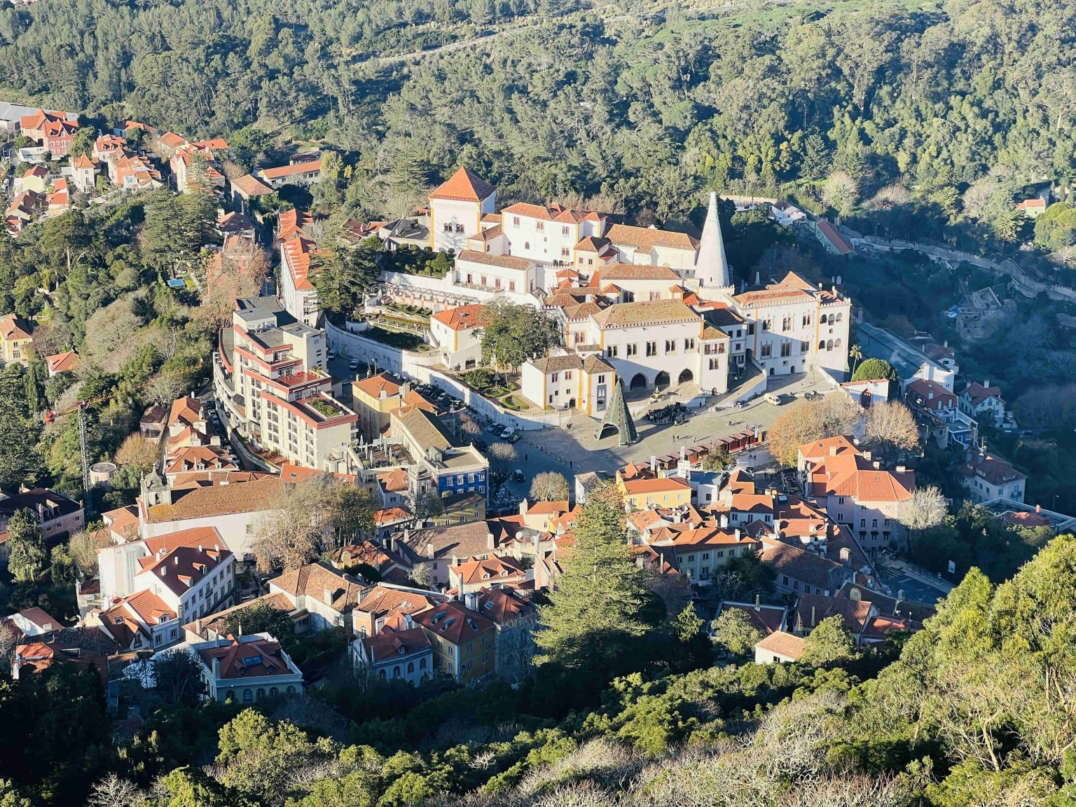 The National Palace of Sintra as seen from the Moorish Castle in Sintra, Portugal
